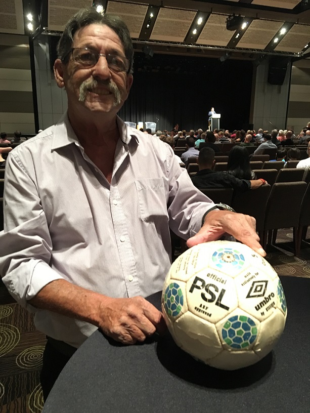 Among the audience tonight was Narellan resident Danny Himbrechts, who not only was one of Brett Emerton’s coaches but he also brought along one of his proudest possessions: the first ball used in the very first game of the National Soccer League (NSL) way back in 1977.
