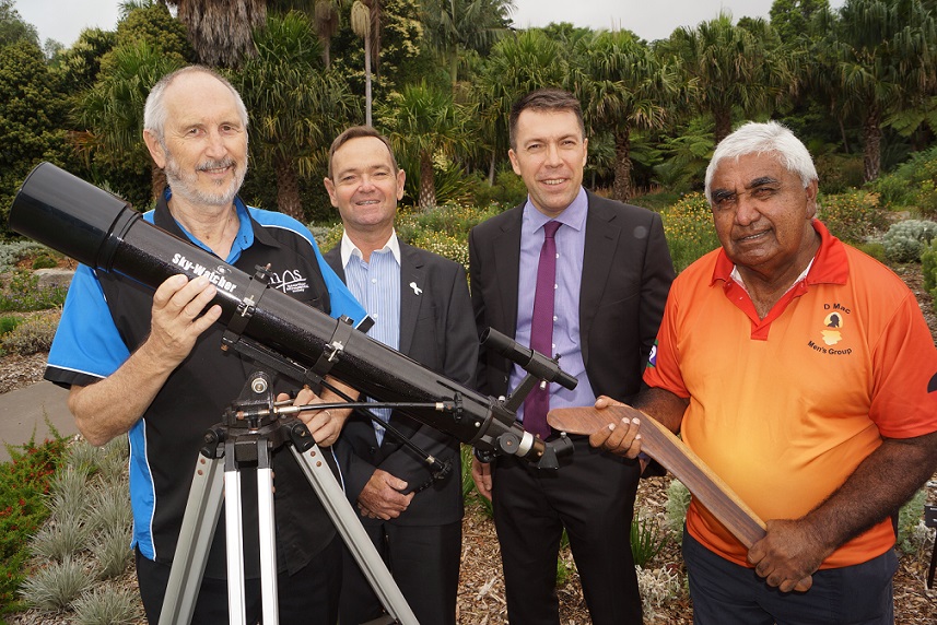 Caring for Country by supporting Earth Hour: Tony Law of the Macarthur Astronomical Society, Camden mayor Peter Sidgreaves, Campbelltown mayor George Brticevic and Dharawal elder Uncle Ivan Wellington at the Mount Annan Botanical Gardens.