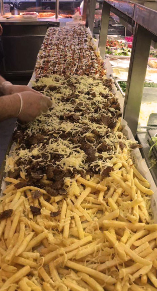 Basically you take some halal kebab meat, add chips and top it all with cheese and three sauces – garlic, chili and barbecue.