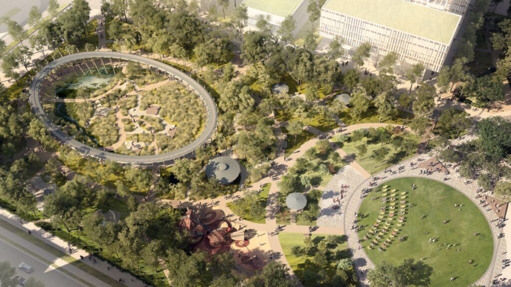 FDC will lead the delivery of the world‑class park infrastructure, including the signature Sky Ring, Woven Play and Interwoven Heart play areas, and the multi‑use Gathering Green with space for up to 5,000 people.