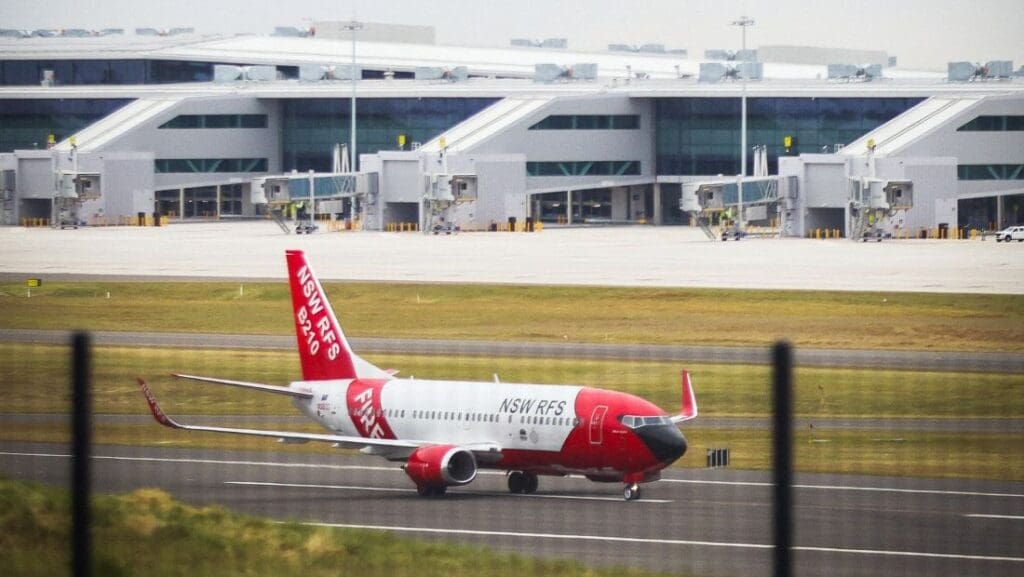 The eagle has landed at Western Sydney International airport: as part of a multiagency emergency exercise, just after 8am this morning NSW Rural Fire Service 737 aircraft landed on the WSI runway, the first time a jet has landed at the new airport.