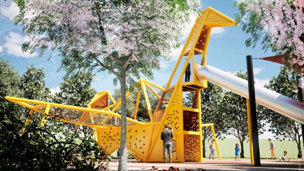 Centrepiece of the new playground will be an origami crane-themed play structure that will provide a unique space for children to enjoy a variety of play elements.