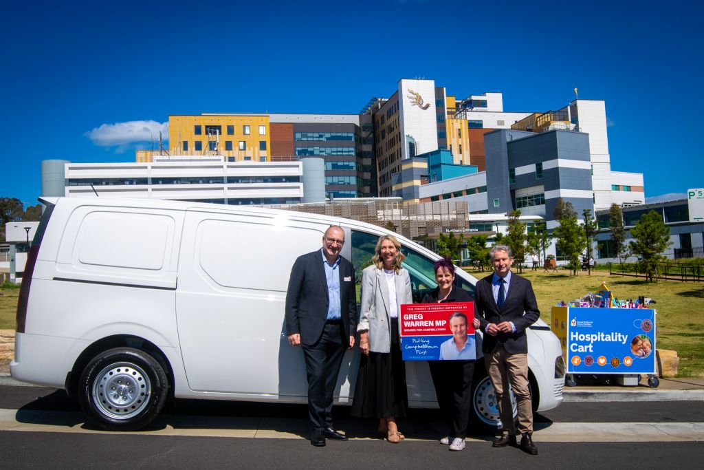 From left, Grant Isedale (general manager, Campbelltown Hospital), Claire Barber (CEO Ronald McDonald House Western Sydney), Mez Nessi (program coordinator, hospitality carts) and MP Greg Warren alongside the new Van purchased with CBP funds and the existing hospitality cart.